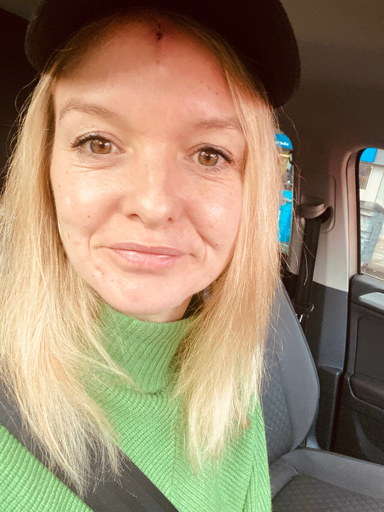 Finally, just before 5pm, it’s finished. There is no cancer left in my head, only a stitched-up wound running from my hairline to just below halfway down my forehead, all covered with a huge plaster. I put on a grey beanie hat gifted to me by a sweet friend and am grateful it’s cold outside. I’m going back that evening to my family in Glasgow with my sore head and it’s a long train journey but I just want to get home.